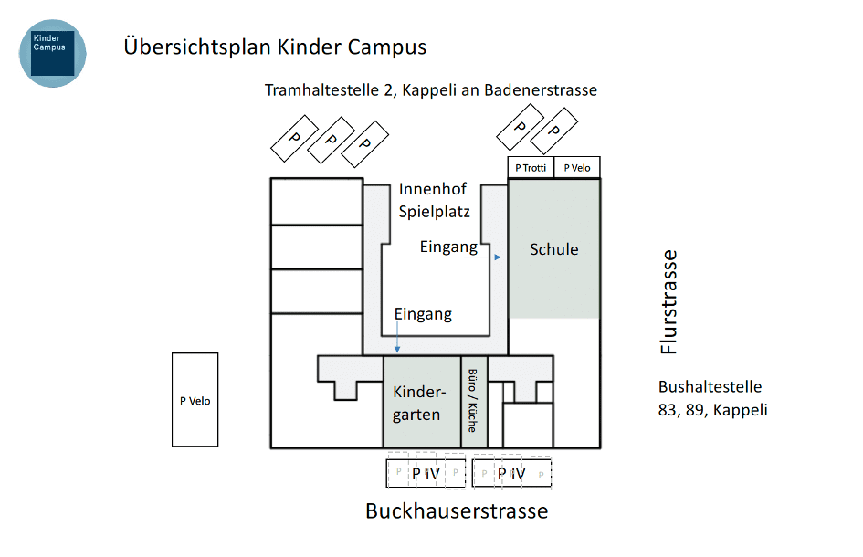 Die Privatschule ist mit Tram 2, Bus 83 und Bus 89 erreichbar. Parkplätze sind vorhanden.